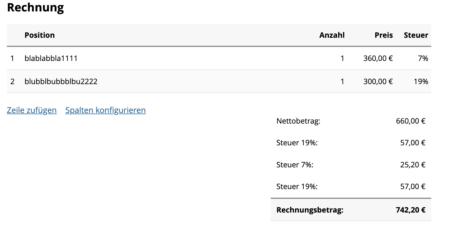 Seit Kurzem muss ich jedoch Rechnungen erstellen, die sowohl eine Position mit 7%, also auch eine mit 19% MwSt. enthalten müssen.